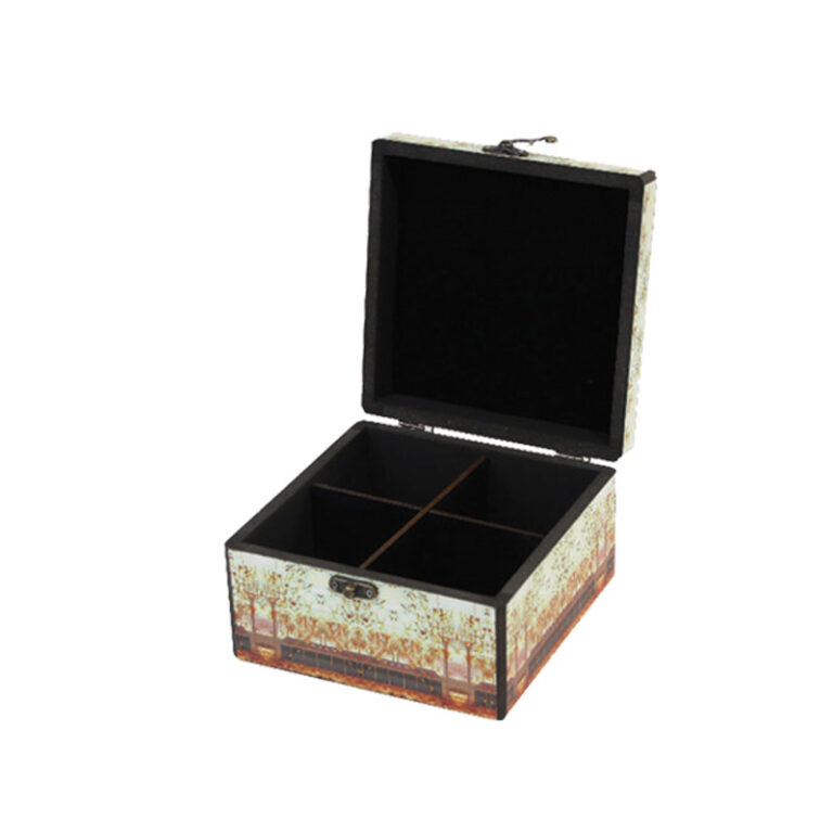 این جعبه دکوپاژ با تصویر زوجی در میان درختان پاییزی، حسی از آرامش، عشق و نوستالژی را منتقل میکند. ترکیب رنگهای گرم پاییز، با زمینهی ملایم و بافت تصویری غنی، این جعبه را به یک عنصر دکوراتیو احساسی و لطیف تبدیل کرده است؛ درست مثل یک فریم از یک فیلم عاشقانه.