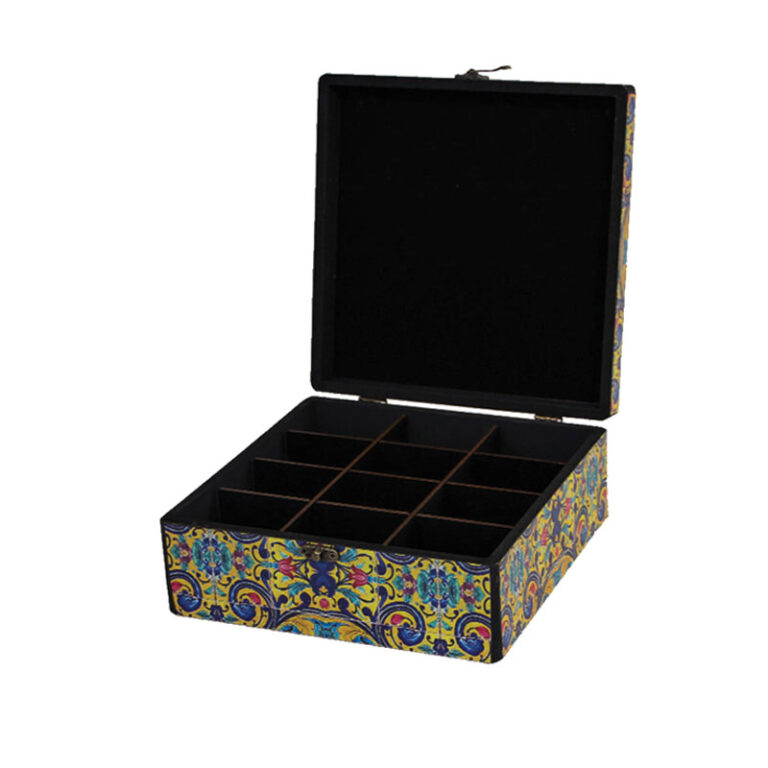 طرح ظریف و چشمگیر این جعبه یادآور کاشیکاریهای عمارتهای تاریخی، سردرها و حمامهای قاجاری است؛ جایی که رنگ و نقش در نهایت هماهنگی به کار میرفتند.