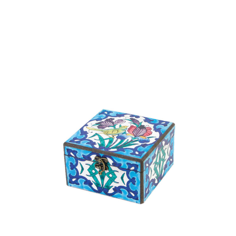 این جعبه دکوپاژ با زمینهی آبی لاجوردی و نقش گلها و پرندگان، یادآور کاشیها و ظروف مینایی ایزنیک است که در معماری عثمانی و هنر اسلامی جایگاه ویژهای دارند. تلفیق طیف آبی با سبز و ارغوانی، حس آرامش، لطافت و اصالت شرقی را منتقل کرده و این جعبه را به یک عنصر دکوراتیو چشمگیر تبدیل میکند.