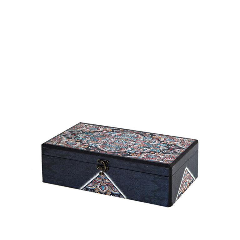 این جعبه دکوپاژ، تلفیقی چشمنواز از اصالت ترمه یزدی با هندسهی آرامبخش ماندالا است. زمینهی سرمهای عمیق، بومِ باشکوهی برای نقش و نگارهای فیروزهای، قرمز اناری، لاکی و نخطلایی ایجاد کرده و حس همان پارچههای فاخر و ارزشمند ترمه اصیل را به میز پذیرایی و دکور خانه میآورد.