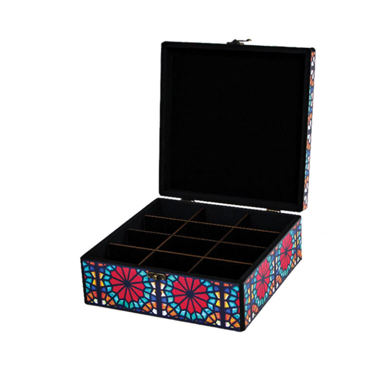 نمای شمسهی چندپر روی زمینه تیره، کنتراست قوی و جلوهای لوکس ایجاد میکند؛ با دکور سنتی، ایرانی–مدرن و مینیمالِ گرم بهسادگی ست میشود. تقسیمبندی ۱۲خانه، جعبه را هم برای پذیرایی حرفهای و هم برای نظمدهی اقلام ریز ایدهآل میکند. ساختار محکم MDF و روکش بادوام، این مدل را برای استفاده روزمره در منزل، کافه و هتل مناسب میسازد و آن را به هدیهای ارزشمند برای علاقهمندان صنایعدستی ایرانی تبدیل میکند.