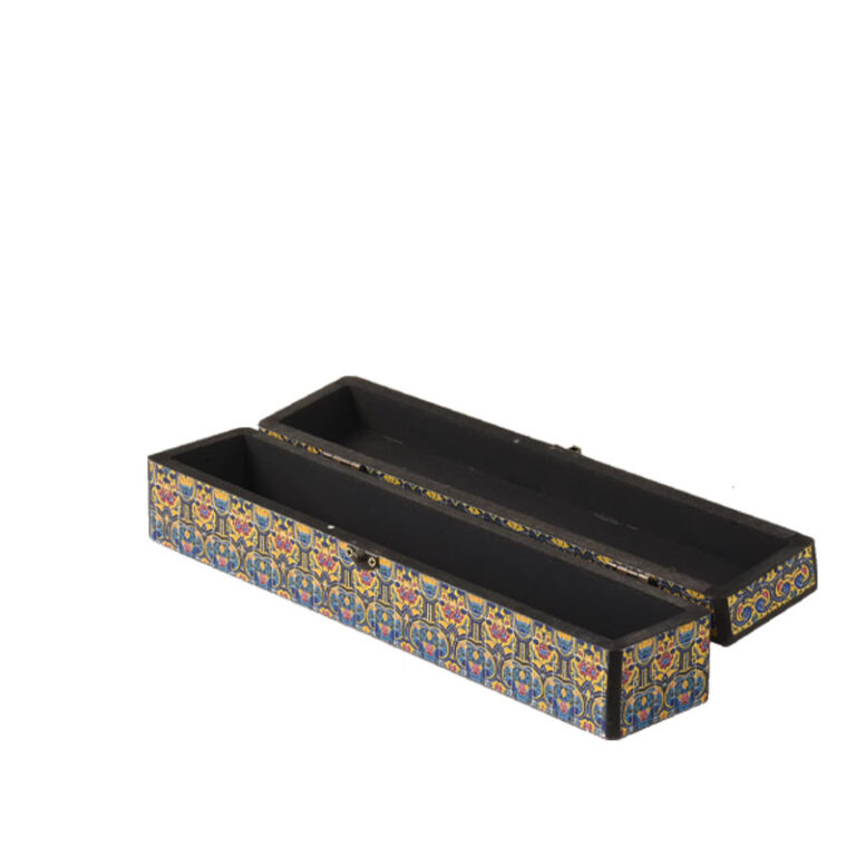 جعبه عود طرح کاشی اسلیمی آبی یک محصول هنری و کاربردی است که با الهام از نقشونگارهای ایرانی و کاشیکاریهای سنتی طراحی شده است. این جعبه از چوب مرغوب و سبک ساخته شده و سطح آن با طرح اسلیمی و رنگهای آبی و طلایی پوشیده شده است که جلوهای چشمگیر، اصیل و شیک به دکور شما میبخشد.